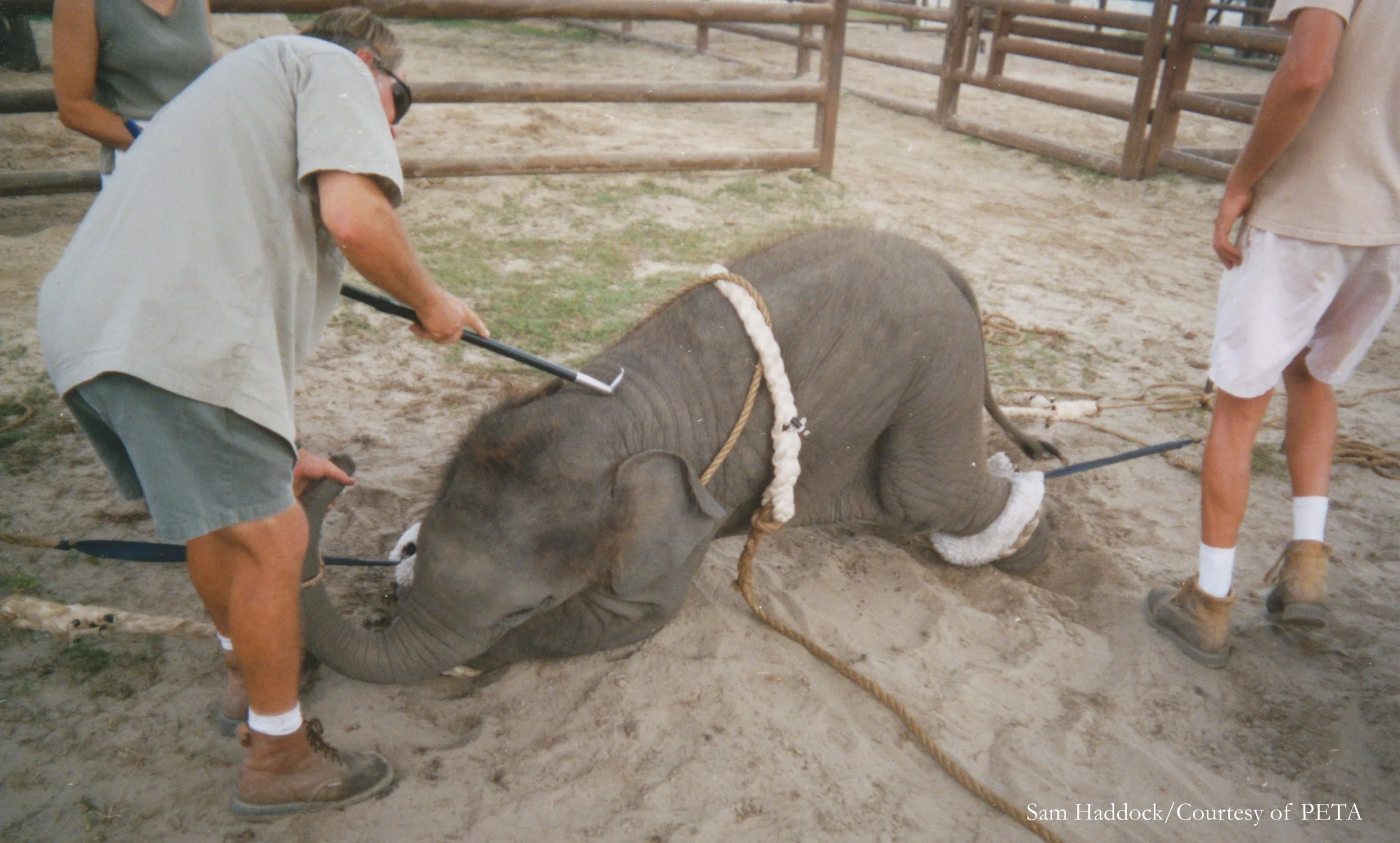 Captive elephants are often subjected to extremely cruel and abusive training methods. The constant threat or use of punishment is a key part of circus training, and such treatment has been linked to lasting scars — both physical and mental — for these intelligent, social animals (9, 12, 14). The process of training Asian baby elephants can involve physical restraint, forcing them to perform unnatural tricks through the use of bullhooks, whips, and electric prods, and depriving them of food, water, and rest to increase compliance — practices that can unsurprisingly cause significant physical and psychological distress (1, 2, 3, 6).