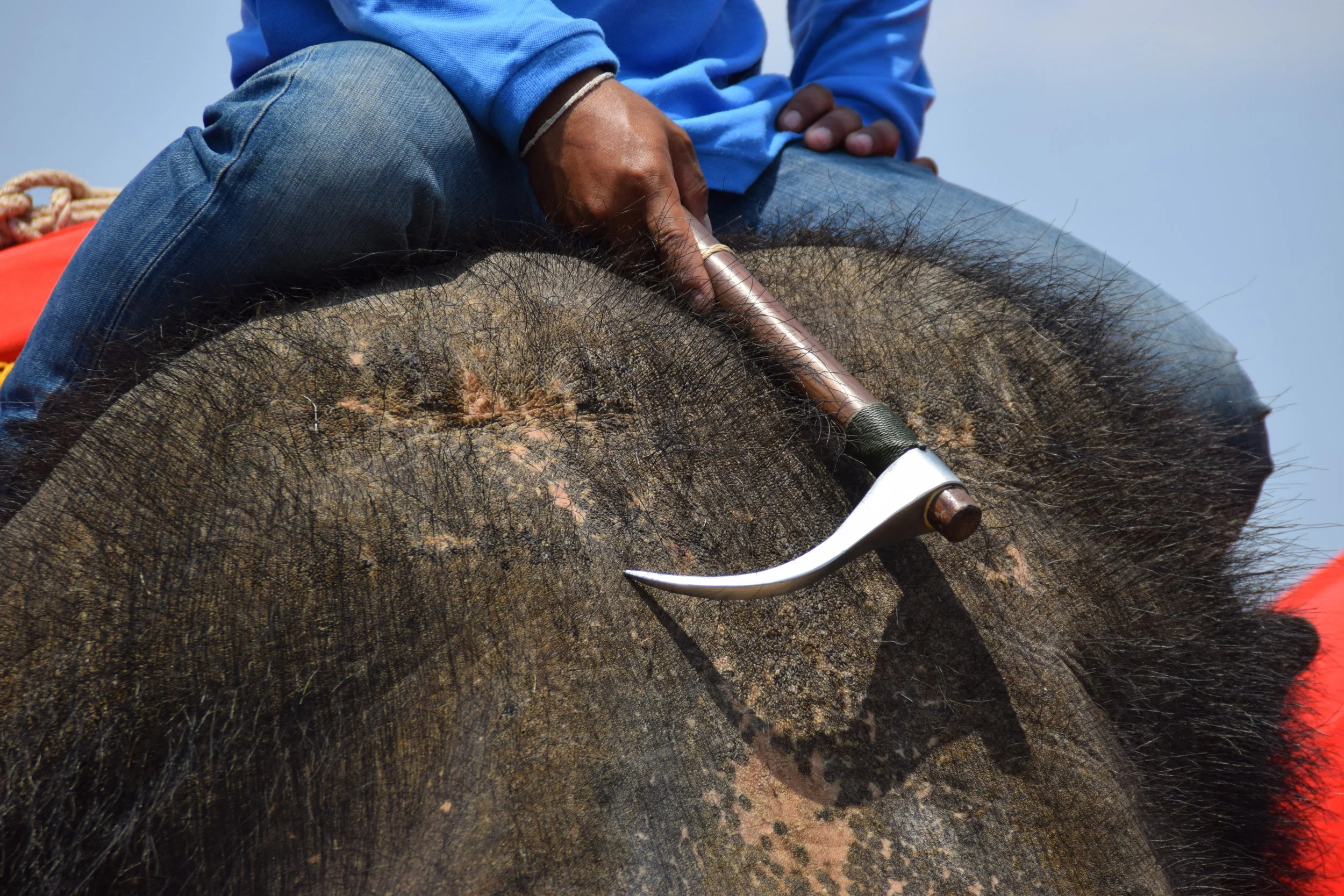 Many elephant workers in zoos, circuses, and temples, or mahouts (local elephant handlers), use bullhooks — wooden sticks with sharp steel or bronze hooks at the end — to manage and discipline elephants. The use of bullhooks inflicts maximum pain and fear, ensuring compliance through learned fear of punishment (1, 6, 8, 10).